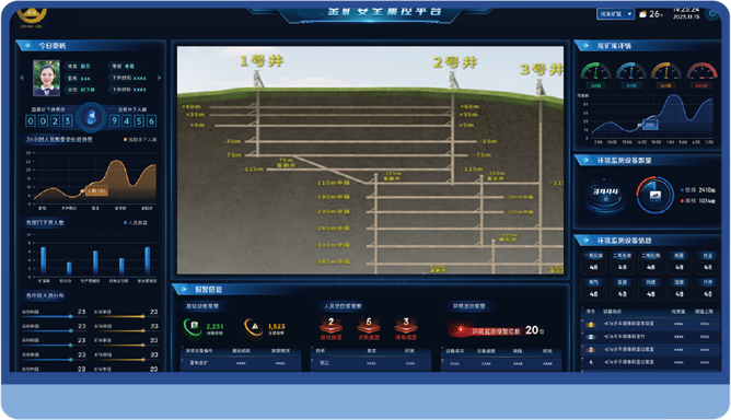 井下环境、人员位置等实时信息的综合集成、联动控制与可视化;实现生产执行、安全管控、经营管理等系统的综合集成与可视化展示;